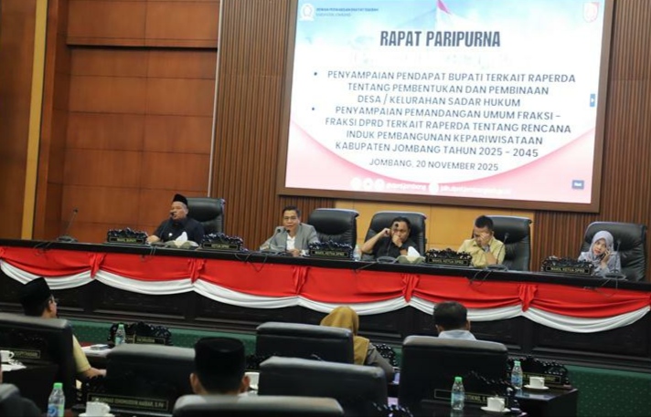 JOMBANG, WacanaNews.co.id — Sidang Paripurna DPRD Kabupaten Jombang dalam pembahasan Rancangan Peraturan Daerah (Raperda) Inisiatif tentang Pembentukan dan Pembinaan Desa/Kelurahan Sadar Hukum dengan agenda penyampaian pendapat bupati, pada Kamis (20/11/2025).