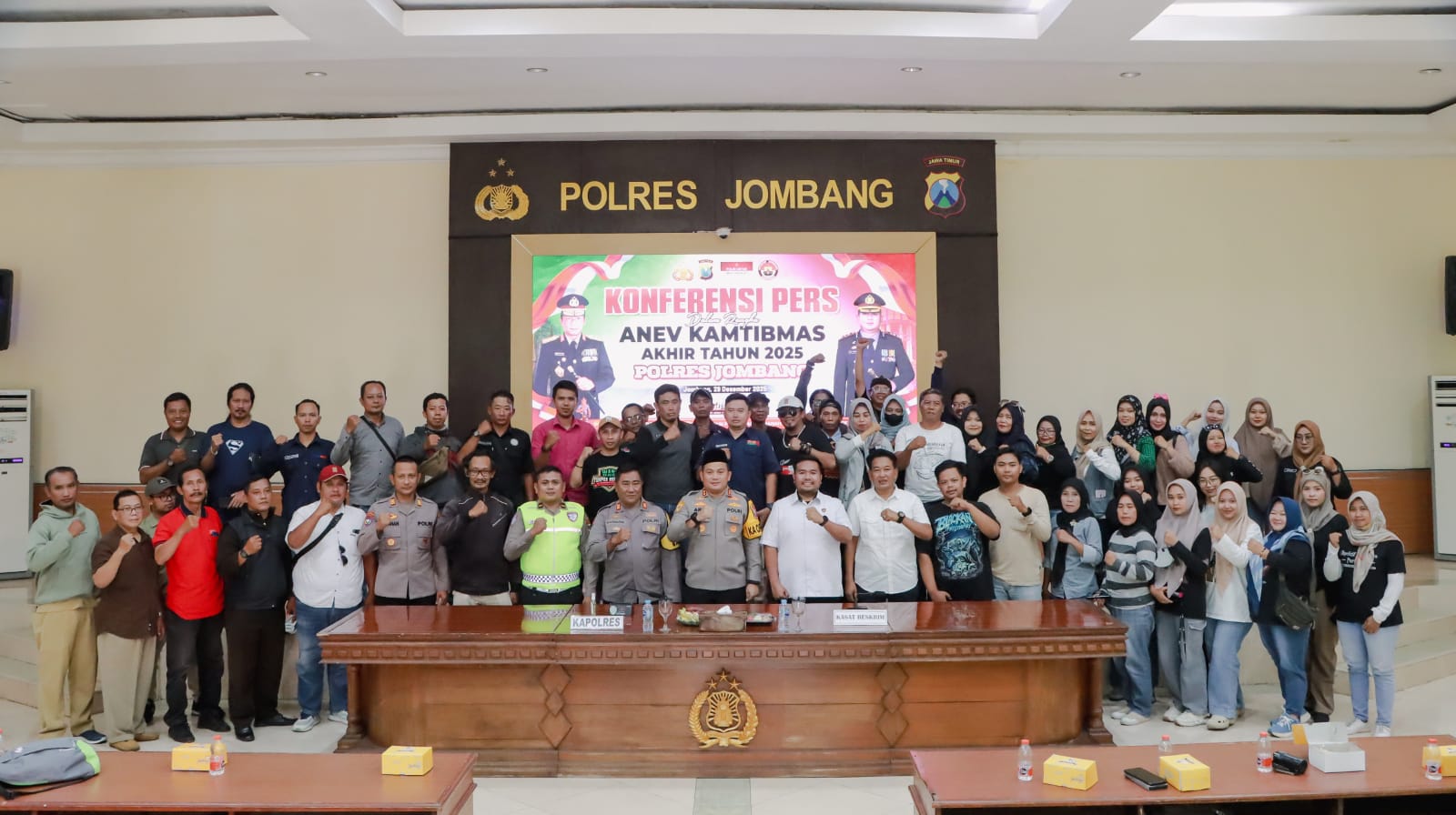 Kapolres Jombang AKBP Ardi Kurniawan, S.H., S.I.K., CPHR didampingi AKP Dimas Robin Alexander, para Pejabat Utama (PJU) Polres Jombang,menyampaikan bahwa secara umum situasi kamtibmas sepanjang tahun 2025 berada dalam kondisi aman, terkendali, dan kondusif, berkat sinergi yang solid antara Polri, TNI, pemerintah daerah, serta dukungan aktif masyarakat.